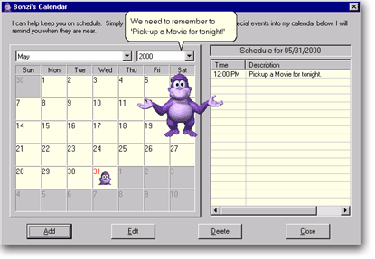 Windows, Microsoft Internet Explorer, and Microsoft are registered trademarks of Microsoft Corporation. BonziBUDDY and BONZI are trademarks of BONZI.COM Software. All rights and liabilities with respect to BonziBUDDY belong solely to BONZI.COM Software. BonziBUDDY uses Microsoft Agent Technology. Copyright © 1995 - 2000 - All Rights Reserved.